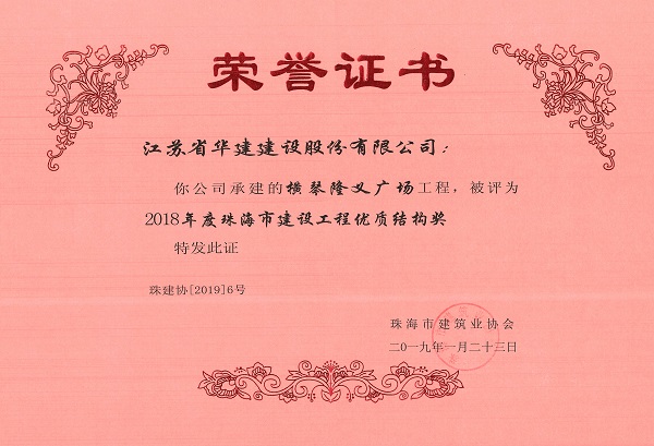 横琴隆义广场获2018年度珠海市建设工程优质结构奖