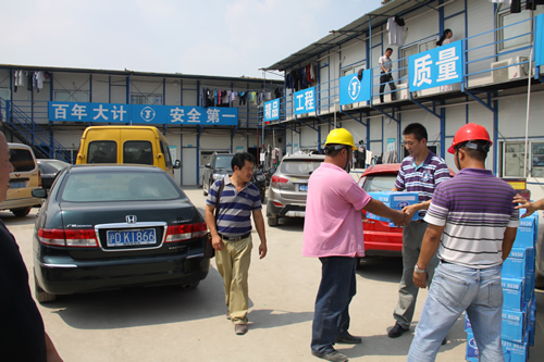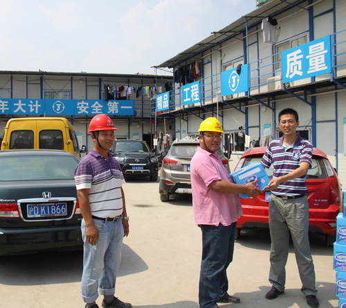 为一线员工送清凉 时间:2013-07-29 4687 骄阳似火,热浪滚滚,持续近一个月的高温天气给工程正常施工带来了很大的影响,奋战在烈日炎炎下的一线员工的身体状况时刻牵动着公司领导的心。7月29日,上海室外温度更是超过40度,半岛官网入口网页版副总经理、上海分公司总经理杨杰特地委托总工程师魏春明、工会副主席陈德权等同志赴由公司承建的上海枫叶国际学校工地看望一线作业人员,为员工送去了矿泉水、毛巾等清凉慰问品,并叮嘱要注意避开高温作业时段,保护身体,确保夏季施工生产安全。