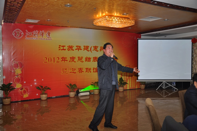 在随后的迎春联谊会上,一台由惠州公司上下精心准备、齐力打造、自编自演的精彩演出,表达出了广大员工对2012年取得业绩的自豪与喜悦,以及对公司美好未来的憧憬与向往。在演出中,由机具处员工庄曙演绎的男声独唱,以高亮的美声唱法,让在座嘉宾击掌叫好;四位机关员工表演的三句半《华建style》,诙谐幽默谈发展,回顾展望颂华建,让在场观众掌声不断;蔡总和华总两位领导带头献歌,唱出了华建人对事业的激情与豪迈,对未来的坚定与信仰。最后,由宗总、林总两位总部领导和惠州公司12名男女员工组成的合唱团献上的一曲《华建之歌》更是将整个活动推向了高潮,台上的小合唱变成了在场华建人的大合唱,掌声欢呼声此起彼伏,年会在欢歌笑语中圆满结束。新年思变,实干兴业,华建人立足惠州,一路高歌,奋勇前行。