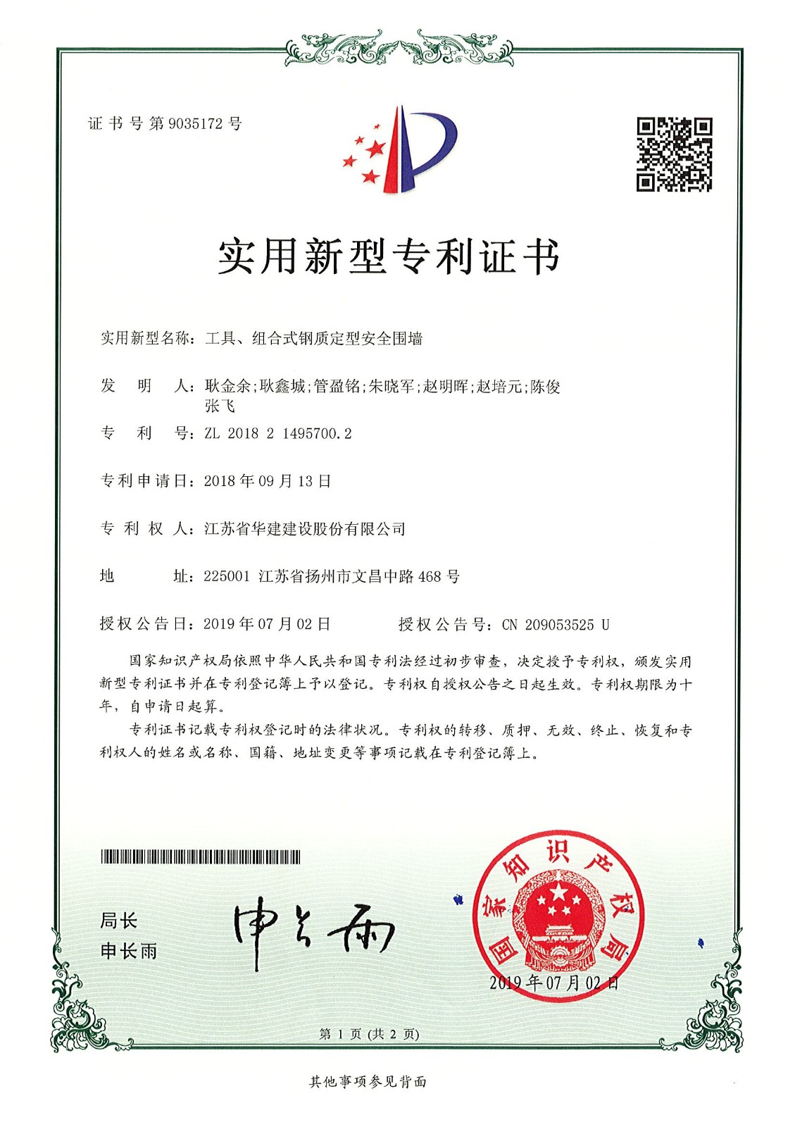 实用新型专利证书(工具、组合式钢质定型安全围墙)