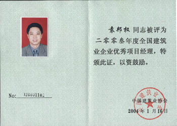 他本人先后被评为深圳市优秀项目经理、扬州市优秀项目经理、江苏省优秀项目经理、江苏省建筑业质量管理先进个人、扬州市劳动模范、江都市有突出贡献的中青年专家、建设部优秀项目经理,在国家级刊物发表论文40多篇、省和国家级工法8项,并有5项专利,为企业的发展作出了较大贡献。