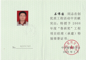 该同志先后担任过多项工程的项目经理,施工中所体现出的管理水平、协调能力、进度控制赢得了主管部门和甲方的高度评价。尤其值得一提的是,石伟国担任深圳市最大商住楼工程——深圳红树西岸(建筑面积35万平方米)项目经理期间,精心组织,精心施工,精心管理,创出优良的工程质量,工地成为业内外进行观摩学习的重要基地,前来参观者络绎不绝,人数逾3000人次,都深深叹服于有口皆碑的工程质量。该工程在2004年度深圳市上半年度工程质量、安全生产文明施工检查中获第一名,被评为广东省、深圳市“双优”、深圳市金牛奖、江苏省“扬子杯”、广东省“金匠奖”,2008年度问鼎全国建设工程最高质量荣誉鲁班奖。