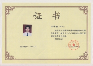 他既懂技术又懂管理,是个复合型人才,多次被评为江苏省优秀项目经理、江苏省建筑业技术进步先进个人、扬州市有突出贡献的中青年专家、全国优秀项目经理、创鲁班奖工程项目经理,被聘为广东省、深圳市建设工程专家库专家。