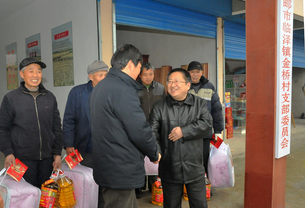公司领导节前扶贫慰问 时间:2010-02-10 5435 2月10日,公司副总经理程杰一行冒雨赴公司对口扶贫的高邮临泽镇金桥村进行走访慰问。程总参观了由我公司支持建成的金桥村村民服务中心,了解去年该村的基本情况和今年的发展打算,程总希望金桥村今后要在扶持特色产业上作文章,努力形成自力更生,自我造血的能力。随后,程总看望了当地低收入贫困农户,给他们送去节日的问候和慰问品。 金桥村地处里下河地区腹地,位于高邮、宝应、兴化三县交界处。从2008年公司定点扶贫该村以来,公司着力帮扶改善交通环境,发展高效农业,取得一定成绩,受到市扶贫办的肯定。