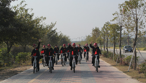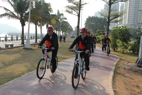 2012年元旦,珠海公司开展骑自行车迎新年活动。机关全体员工统一着装,头戴印有半岛官网入口网页版标识的安全头盔,骑着统一插有半岛官网入口网页版小红旗的自行车,从珠海海滨浴场出发,沿着海滨绿道,一直骑往终点淇澳岛,来回全程56公里。无论是年近6旬的老员工,还是刚工作不久的新员工,个个争先恐后,奋勇向前。缪国枢总经理身先士卒,骑行在队伍的最前面。这支特殊的“骑兵队”在新年的第一天飞驰在珠海的海滨绿道上,引导车上醒目的半岛官网入口网页版大旗迎风招展,每辆车前面的小红旗也分外引人注目,形成了一道亮丽的风景线,引得许多路人和游客纷纷驻足观望,有的摄影爱好者用镜头记录下这美丽的一刻。