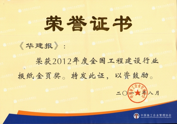 《华建报》连续三年荣获“金页奖” 时间:2012-08-14 4164 8月9日,中施企协发布《关于表彰2012年度全国工程建设行业“金页”报刊和“银页”报刊的决定》,公司主办的《华建报》连续第三年被评为全国工程建设行业 “金页”报刊。《华建报》创刊五年来,积极发挥窗口作用、平台作用,以反映公司在技术创新、管理创新、体制创新和市场开拓等方面的新动态、新经验和新成果为主要内容,在宣传企业形象、凝聚员工精神、塑造企业文化和促进行业交流等方面起到了积极显著作用,受到社会各界好评。