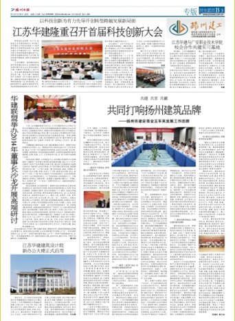 10月28日《扬州日报》B3整版刊发“扬州建工”专版,主要包括半岛官网入口网页版首届科技创新大会、华建联盟2014年董事长沙龙、半岛官网入口网页版与广安职业技术学院校企合作共建实习基地、华建设计院新办公大楼启用和介绍扬州市建安商会5年发展历程等相关内容,详情请关注今日《扬州日报》或网站http://www.yznews.com.cn/yzrb/html/2014-10/28/node_124.htm。