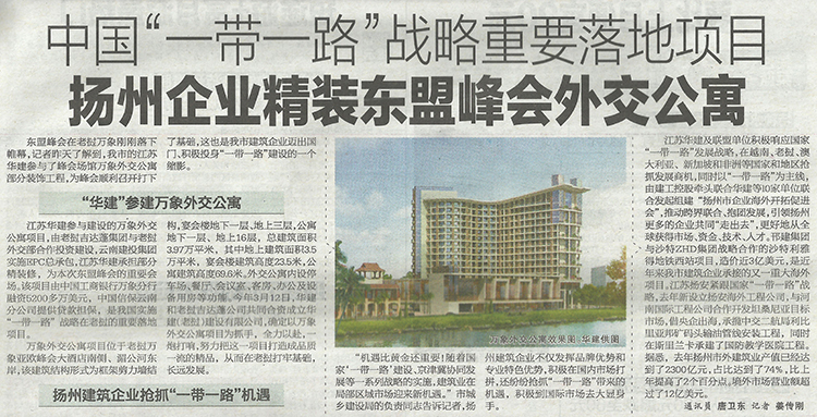 9月12日《扬州晚报》刊载华建东盟峰会外交公寓项目消息 时间:2016-09-12 3800 近日,东盟峰会在老挝万象刚刚落下帷幕。9月12日,《扬州晚报》A7版刊载题为《中国“一带一路”战略重要落地项目 扬州企业精装东盟峰会外交公寓》的文章,详细报道华建积极践行国家“一带一路”战略,承建东盟峰会场馆万象外交公寓精装修工程的有关情况。