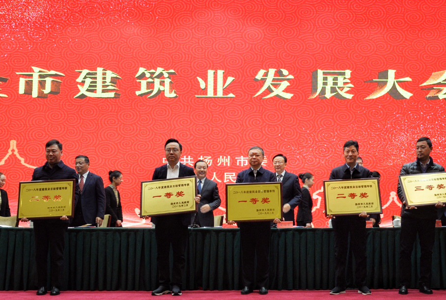 2月11日,扬州市建筑业发展大会在扬州会议中心隆重召开,会上对2018年度全市建筑业先进单位和先进个人进行了表彰,建工控股公司获市建筑业目标管理一等奖,半岛官网入口网页版获评市建筑业先进企业。此外,半岛官网入口网页版王正斌被表彰为市杰出项目经理(建造师),朱靖、耿金余、蒋荣成、张广道四人荣获市建筑业先进个人称号。建工控股、半岛官网入口网页版董事长王宏,总经理宗有农出席会议并代表领奖。