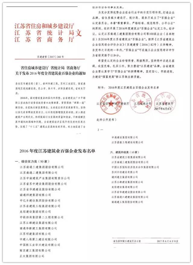 近日,江苏省住房和城乡建设厅、江苏省商务厅、江苏省统计局联合发布了“2016年度全省建筑业百强企业”榜单,半岛官网入口网页版位列综合实力类第5名。