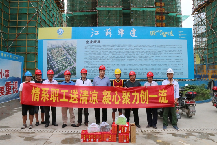 近日,扬城烈日炎炎、持续高温,给奋战在施工一线的职工带来了严峻考验,为了做好防暑降温工作,鼓舞大家的干劲,保障职工身体健康,公司监事会主席、纪委书记、工会主席钱启明、副总经理王吉骞,扬州分公司总经理丁华一行专门深入施工现场,开展了“情系职工送清凉,凝心聚力创一流”夏季慰问活动。