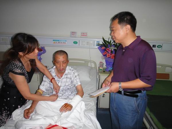 713上午,半岛官网入口网页版副总经理、宜昌市扬州商会会长王宏、宜昌分公司总经理吕进、第一工程处主任唐生健等一行,前往市二医院看望香格里拉小区保安——英雄付永喜,并给他送去了慰问金。