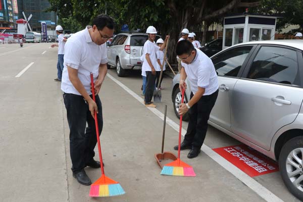 半岛官网入口网页版积极响应海口市“双创”活动 时间:2015-09-01 2575 8月29日上午,海口市龙华区“双创”启动大会在我公司承建的恒大外滩中心项目现场召开,龙华区区委书记王东等领导出席启动仪式,公司副总、海南分公司总经理王宏到会并做表态发言。 随后,会场举办“我爱海口,力争双创”授旗仪式,并组织志愿者“自扫门前雪”,手拿扫把、簸箕等工具,将所属卫生辖区打扫得干干净净,以实际行动来践行“双创”工作。
