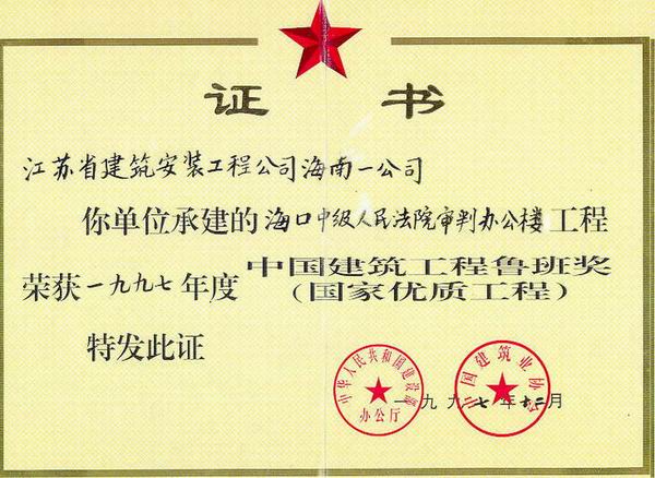 海口市中级人民法院审判办公楼位于海口市金宇路8号,1995年4月竣工,1996年6月被评为海南省优质工程,并荣获海南省优秀建筑二等奖,1997年12月荣获鲁班奖。