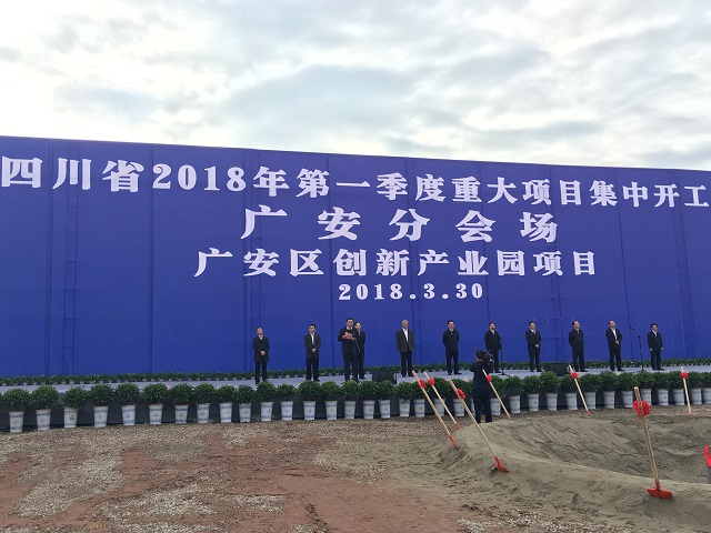 3月30日上午,四川省2018年第一季度重大项目集中开工仪式在我司临港都市产业园基础设施建设项目(标准厂房二期建设工程)现场举行。四川省人大常委会副主任、广安市委书记侯晓春率广安市四套班子成员出席开工仪式,珠海区域公司总经理吕方达参加开工仪式并作为施工方代表发言。