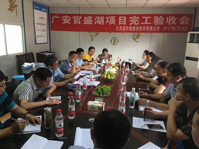 华建第一坝——官盛湖大坝工程顺利通过完工验收 时间:2017-07-03 3543 6月30日上午,华建首个水利项目——官盛湖大坝工程完工验收会在项目会议室召开,广安官盛新区管委会副主任蒋成文主持会议。经项目勘察、设计、监理、区住建局、质监站、水务局、发改局、财政局等单位和业主现场代表实测检查、分别总结汇报后,一致同意工程验收合格。 官盛湖大坝作为一项以城市景观为主、兼有防洪功能的综合性水利工程,主要由枢纽工程、泄洪渠工程组成。官盛湖湖区总库容987.73万立方米,坝顶长349米,最大坝高48.5米,坝体填筑总量达157.93万方。
