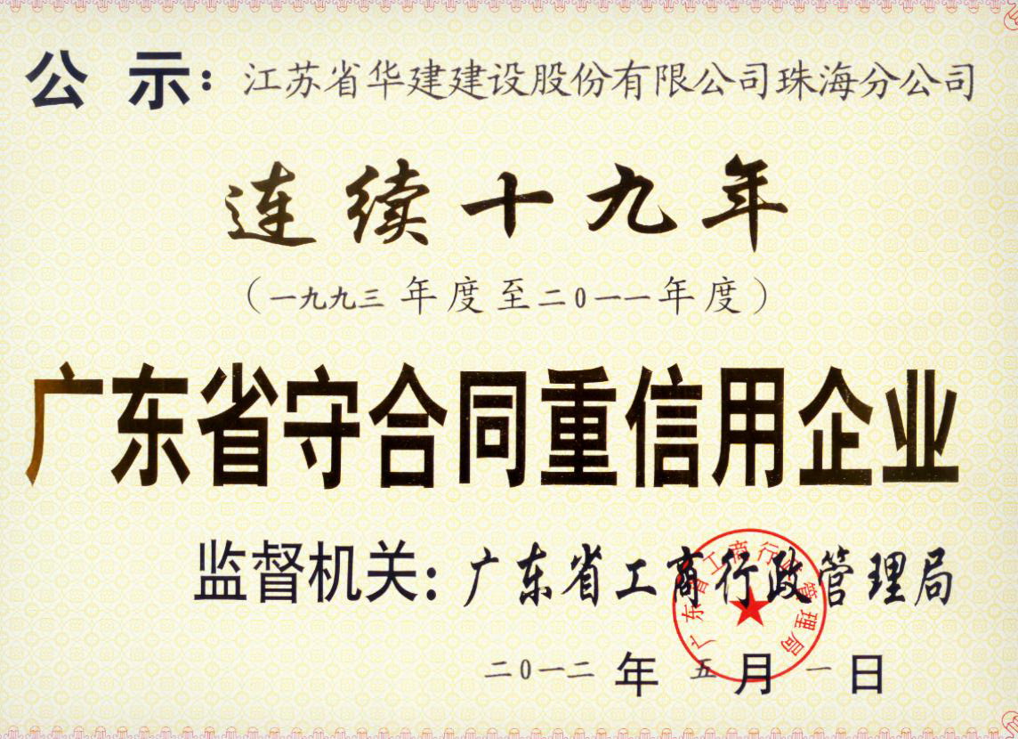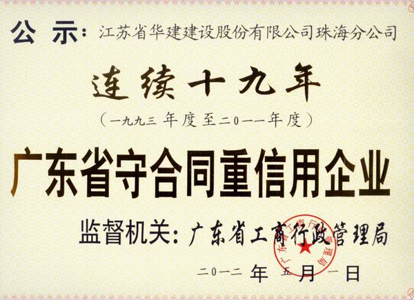 珠海公司连续19年荣获“广东省守合同重信用企业”荣誉称号 时间:2012-06-28 5535 珠海公司连续19年荣获“广东省 守合同重信用企业”荣誉称号 五月份珠海分公司被广东省工商行政管理局授予“连续十九年广东省守合同重信用企业”荣誉称号。