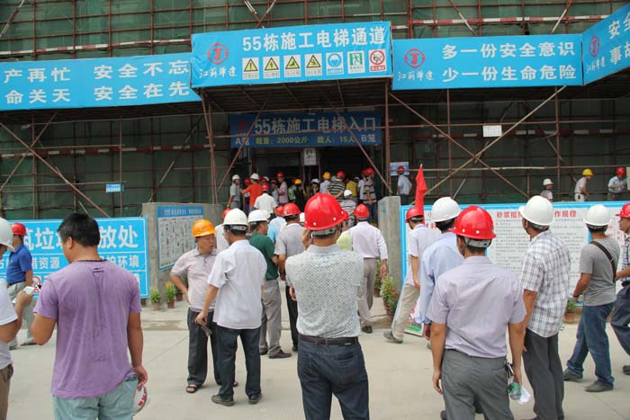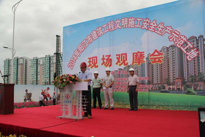 6月17日上午,“2014年阳江市建筑工程文明施工安全生产示范工地现场观摩会”,在我公司第一项目部施工的阳光马德里二期工程项目现场举行。阳江市建设局副局长冯成富、质量安全监督站站长林子欢、书记何声海和各县(市、区)住建局安全生产分管负责人、安监站站长以及所有施工、监理单位负责人、安全管理人员近300人参加观摩会。