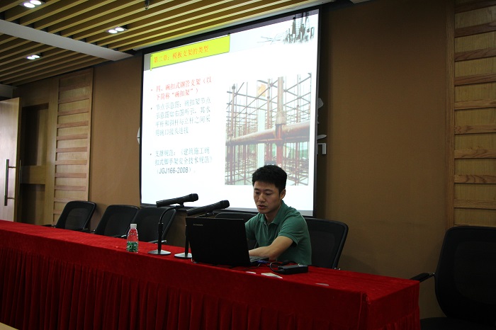 会上,安全设备处主任丁瑞华、副主任陈荣就脚手架和模板支架搭设具体细节实施、施工现场存在的问题等,以图文并茂的形式展示了关键点与控制要领,使培训人员对脚手架搭设和模板支架搭设安全控制点更加清晰明朗。卢总分享了北京绿色施工和公司鲁班奖项目考察学习的经验感悟,就其中珠海公司可以借鉴学习的部分做了深入细致的讲解,他激励大家要以鲁班精神打造华建的精品工程。
