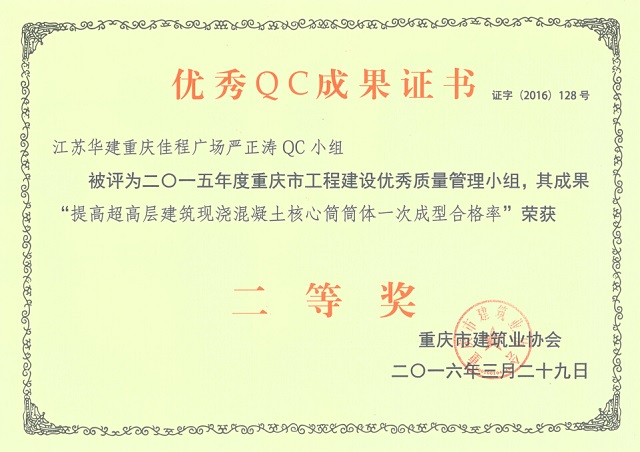 公司新增2项省级QC成果 时间:2016-04-06 3851 近日,重庆市建筑业协会发文表彰了一批优秀QC成果,公司重庆佳程广场项目严正涛、沈正祥QC小组被评为2015年度重庆市工程建设优秀质量管理小组,其成果“提高超高层建筑现浇混凝土核心筒筒体一次成型合格率”、“提高钢筋机械套筒连接合格率”等均荣获二等奖。