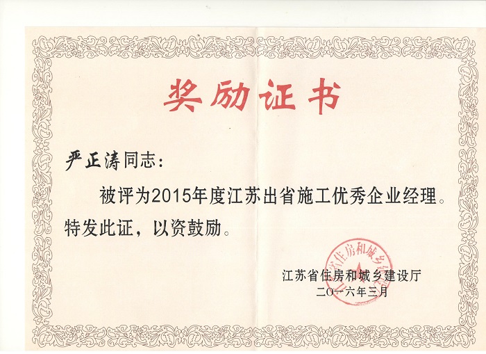 重庆分公司被表彰为“2015年度江苏出省施工先进企业” 时间:2016-04-20 2797 近日,重庆分公司被江苏省住房和城乡建设厅表彰为“2015年度江苏出省施工先进企业”,重庆分公司总经理严正涛荣获“2015年度江苏出省施工优秀企业经理”称号,樊晨亮被评为“2015年度出省施工优秀党务工作者”。