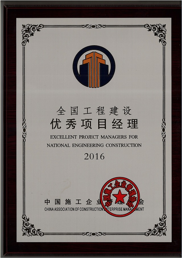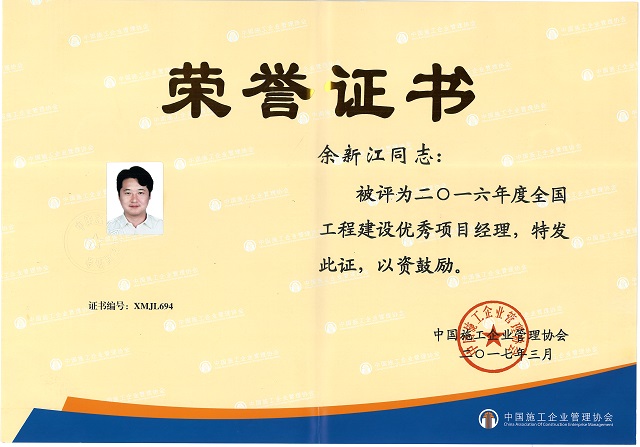 余新江荣获“2016年度全国工程建设优秀项目经理” 时间:2017-04-24 3077 4月20日 ,中国施工企业管理协会第32次年会在厦门召开。会上,中施企协对全国优秀项目经理进行了表彰,珠海分公司余新江同志被授予“2016年度全国工程建设优秀项目经理”称号。