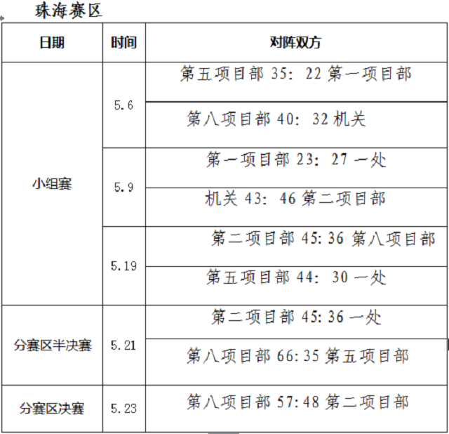 总决赛在珠海赛区冠军第八项目部与重庆赛区冠军第二工程处之间展开。