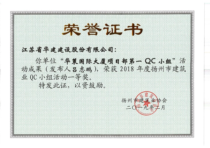 近期,扬州市建筑行业协会公布了2018年度扬州市工程建筑业优秀QC小组活动成果评比结果,公司共有9项成果受到表彰。其中,华策国际大厦项目部QC小组“设备机房减振降噪的创新方法”成果荣获一等奖;华策国际大厦项目部QC小组“提高钢结构工程高强螺栓安装合格率”、威丽诗花园一期QC小组“降低地下室主体结构渗水率”和再生时代项目部QC小组“提高超高层空间钢柱安装精度”三篇成果荣获二等奖;华策国际大厦项目部QC小组“提高轻质隔墙板施工质量”及“提高超高层外包薄壁钢板混凝土组合剪力墙安装精度”、再生时代项目部QC小组“提高绿色施工验收管理评价工作质量”三篇成果荣获三等奖;威丽诗花园二期QC小组“提高混凝土外观质量”和阳光马德里QC小组“铝合金模板混凝土表面气泡控制”两篇成果荣获优秀奖。