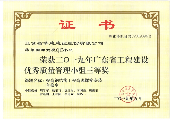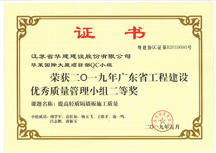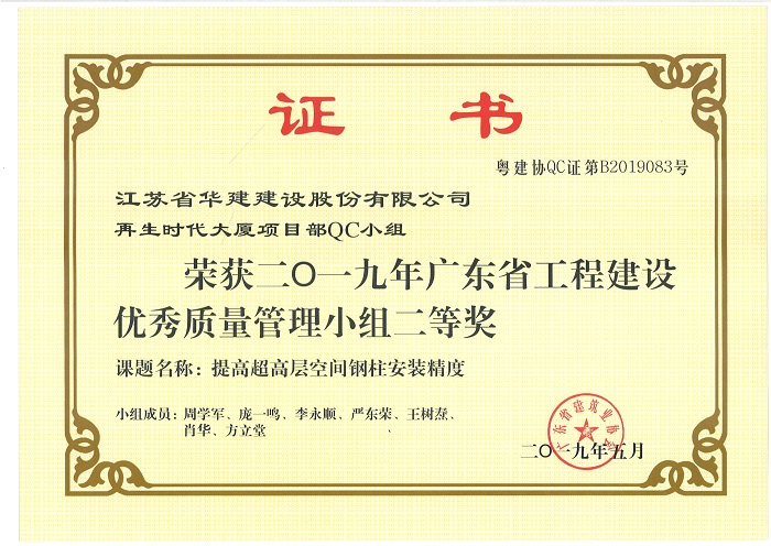公司新添4项省级工程建设优秀QC成果 时间:2019-07-11 3473 近期,广东省建筑业协会发文公布了2019年度广东省工程建设优秀质量管理小组名单,公司华策国际大厦项目部QC小组“提高轻质隔墙板施工质量”、再生时代项目部QC小组“提高超高层空间钢柱安装精度”两项成果喜获二等奖,华策国际大厦项目部QC小组“提高钢结构工程高强螺栓安装合格率”荣获三等奖。 华策国际大厦项目部QC小组“设备机房减振降噪的创新方法”成果在江苏省建筑业协会组织的2019年度江苏省工程建设质量管理小组活动中荣获二等奖。