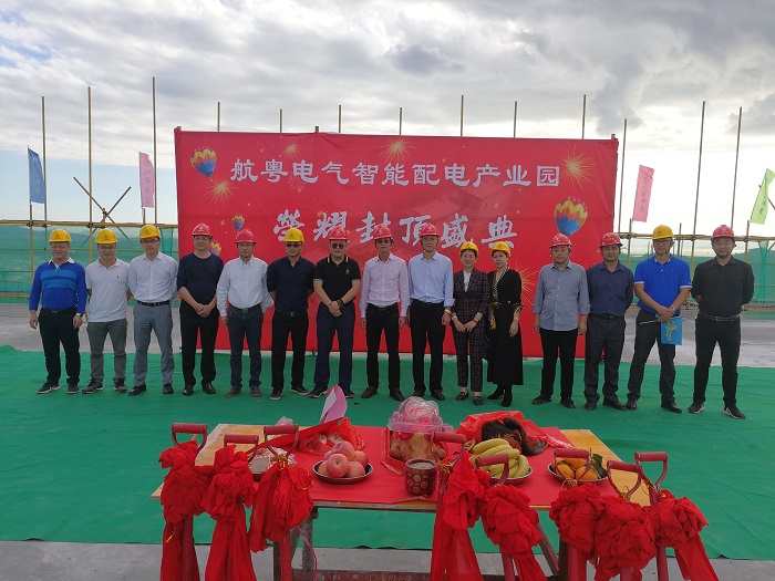 12月18日下午,公司承建的航粤电气四期项目喜封金顶,珠海分公司总经理吕方达、副总经理周学军、第八项目部负责人袁红如和富山管委会蒋道平主任、富山经贸局刘洋局长、广东航粤电气有限公司杨建丰董事长等出席封顶仪式。