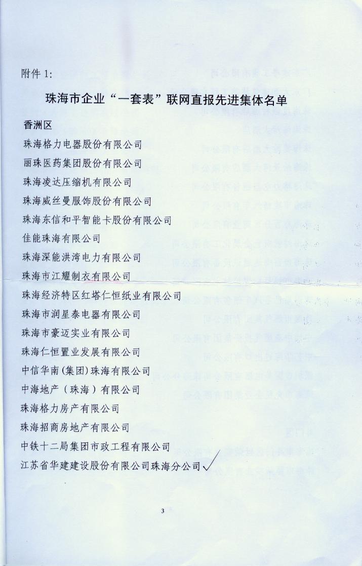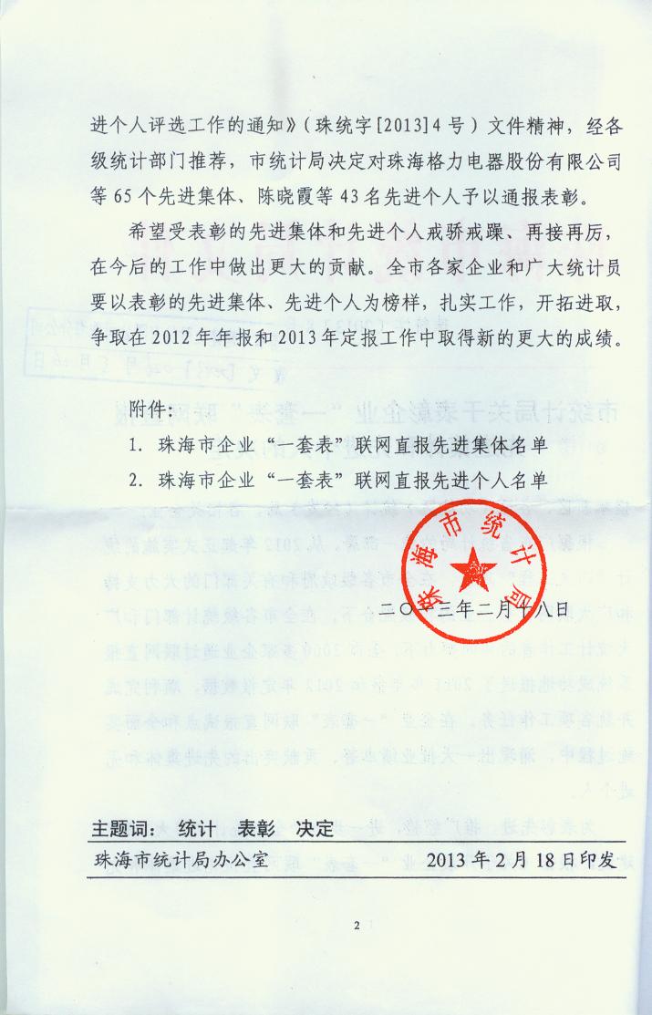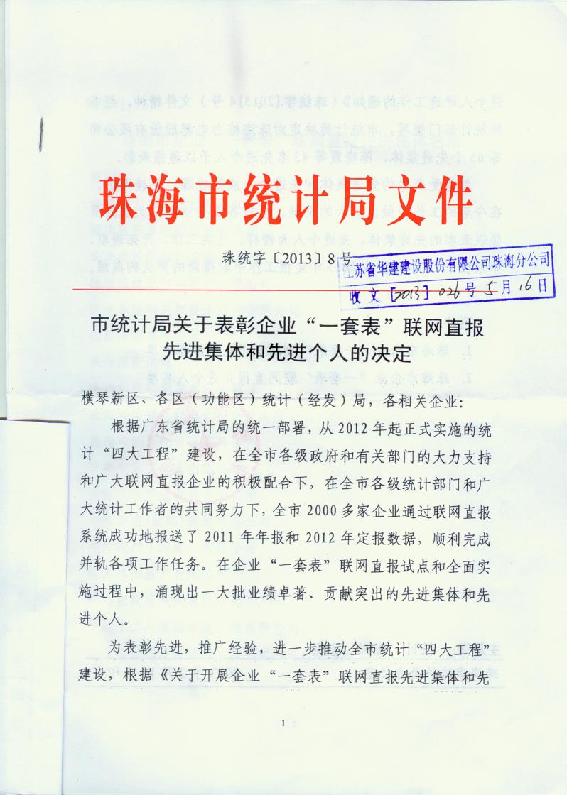 2013年珠海市统计局一套表联网直报工作先进单位