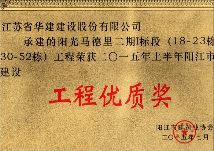 阳光马德里二期I标段(18-23栋、30-52栋)工程获 2015年上半年阳江市建设工程优质奖
