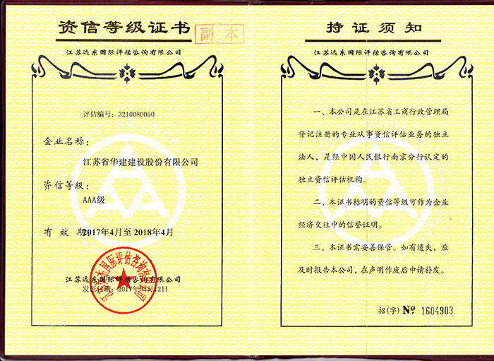 经江苏远东国际评估咨询有限公司专家委员会审定,江苏省华建建设股份有限公司资信等级为AAA级...