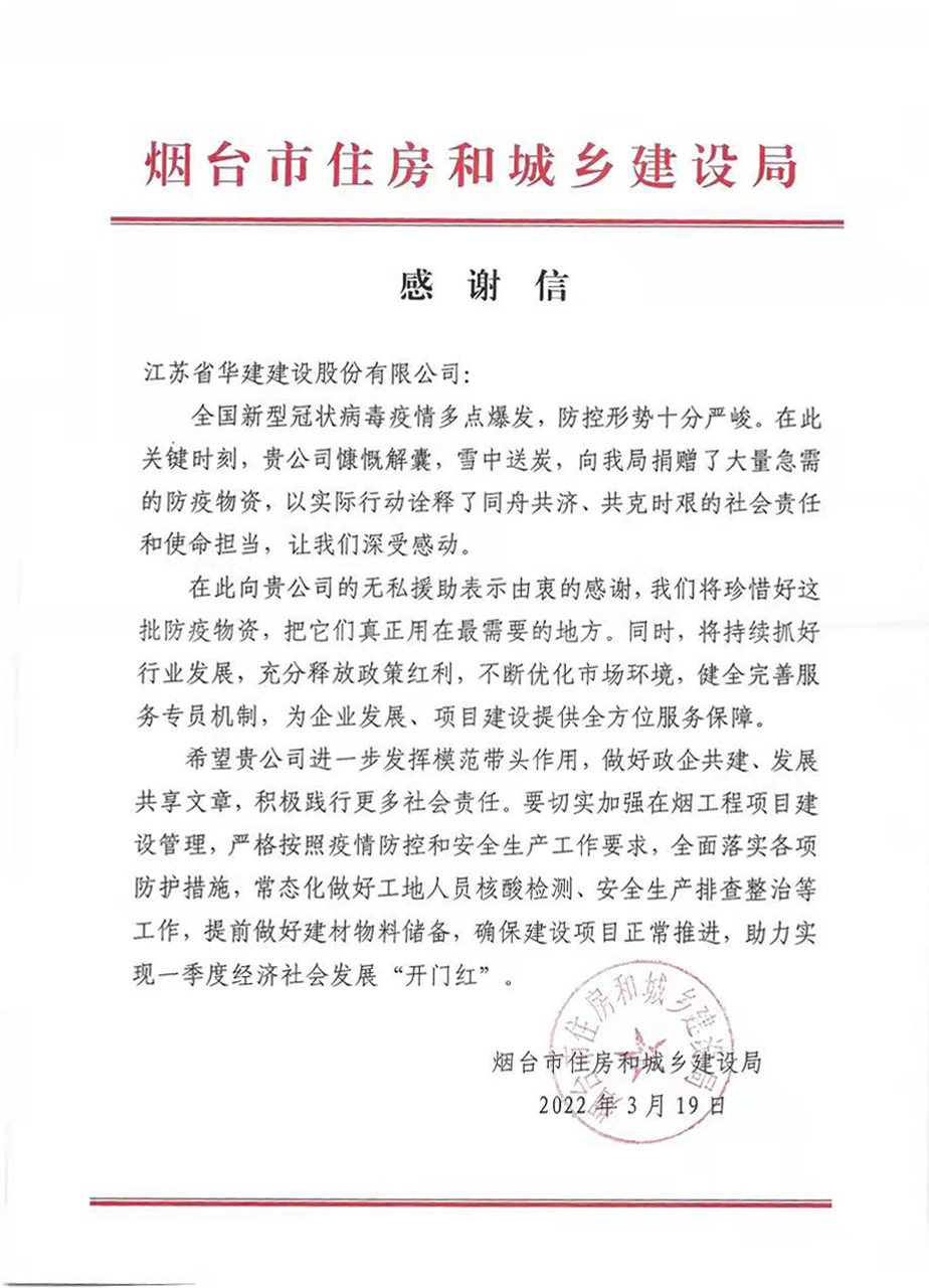 3月19日,公司收到烟台市住建局发来的感谢信,信中对公司大力支持疫情防控,捐赠防控物资表示...