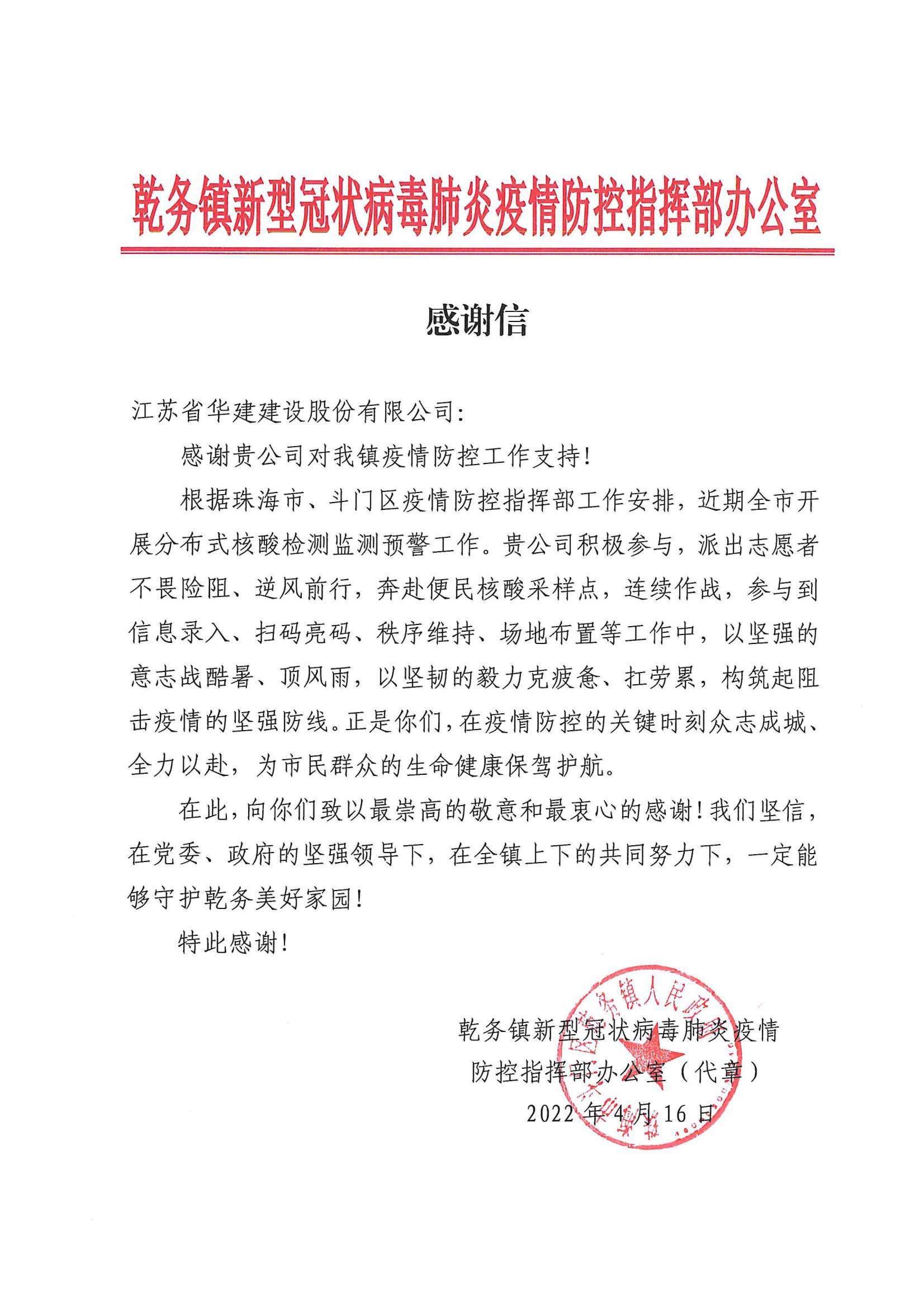 近日,公司收到斗门区乾务镇新型冠状病毒肺炎疫情防控指挥部办公室感谢信,对公司第五直管项目部...