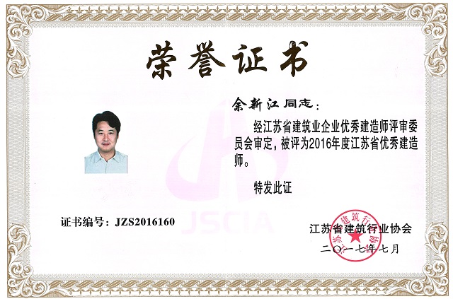 日前,江苏省建筑行业协会下发了《关于2016年度江苏省建筑业优秀建造师的决定》,公司余新江...