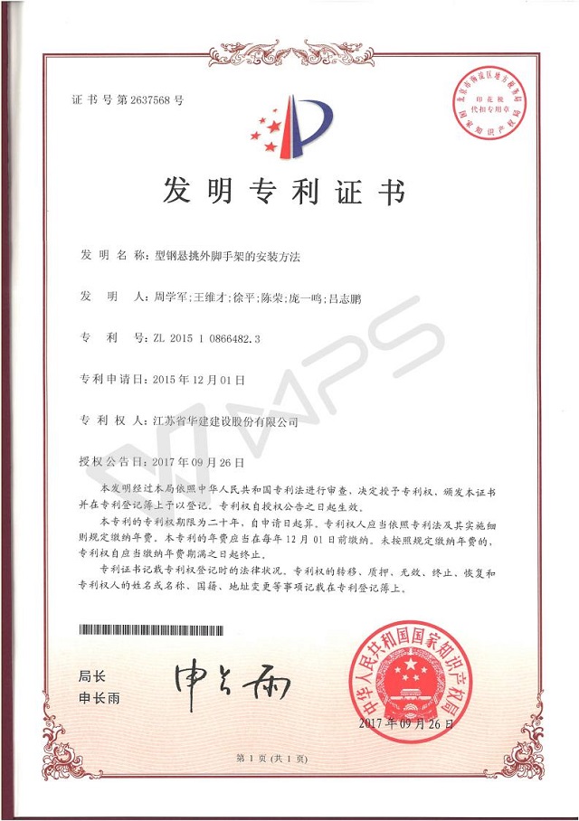 近日,半岛官网入口网页版珠海区域公司《型钢悬挑外脚手架的安装方法》获得国家发明专利授权,这是珠海区域...