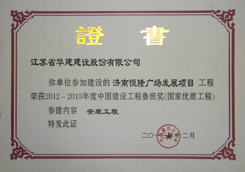 济南恒隆广场喜获“2012-2013年度中国建设工程鲁班奖(国家优质工程)” 时间:2013-12-09 5062 12月5日,2012-2013年度中国建设工程鲁班奖表彰大会在北京友谊宾馆举行,中国建筑业协会对2012-2013年度国内优秀建筑工程进行了隆重表彰,上海公司参建的济南恒隆广场喜获全国建设工程最高荣誉——“鲁班奖”,这是我公司第一次获此殊荣。半岛官网入口网页版副总经理、上海公司总经理杨杰出席了颁奖大会。