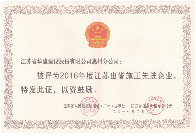 惠州公司荣获“2016年度江苏出省施工先进企业”称号 时间:2017-03-28 2622 3月24日,江苏省人民政府驻深圳(广州)办事处和江苏省住房和城乡建设厅在海口召开2017年江苏建筑业南方区工作会议,表彰了一批施工先进企业、优秀企业经理、优秀建造师和先进个人。惠州公司获评“2016年度江苏出省施工先进企业”,总经理周群利被评为优秀企业经理,黄秀刚被表彰为质量安全先进个人,邵群斌被表彰为经营财务先进个人,刘磊被表彰为新闻报道先进个人。