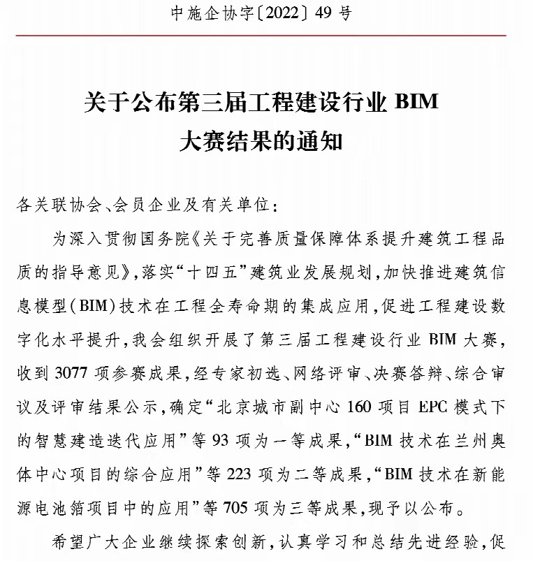 公司中海望京府项目施工阶段BIM综合应用成果荣获国家级BIM大赛三等奖 时间:2022-07-22 3169 日前,中国施工企业管理协会公布了第三届工程建设行业BIM大赛结果,“中海望京府项目施工阶段 BIM 综合应用”从全国3077项申报成果脱颖而出,获大赛三等奖。据悉,此次大赛申报项目多为规模较大公建项目的BIM应用成果,包头中海望京府作为住宅小区项目能够以排名602位获得国家级BIM大赛奖项来之不易。