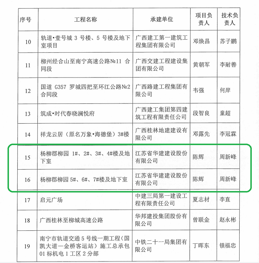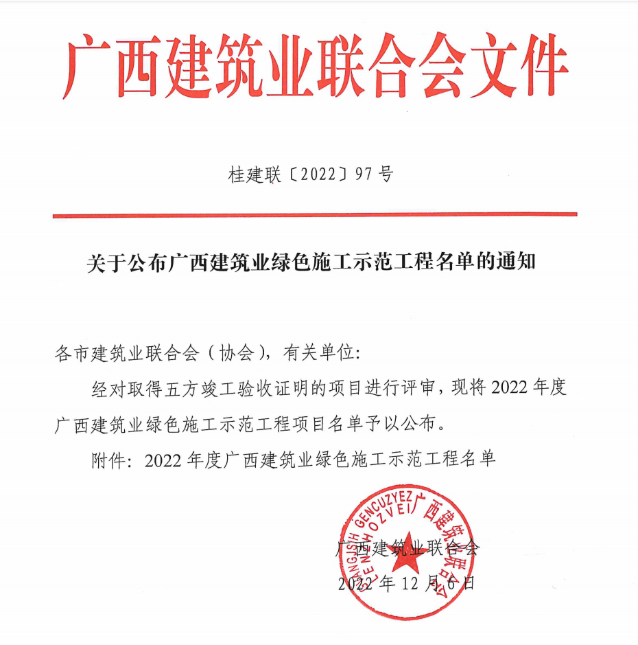 北京分公司两项工程获广西建筑业绿色施工示范工程安全创优奖项 时间:2022-12-30 1843 近日,从广西建筑业联合会传来喜讯,由北京公司总包承建的杨柳郡柳园1#、2#、3#、4#楼及地下室项目和杨柳郡柳园5#、6#、7#及地下室项目荣获“2022年度广西建筑业绿色施工示范工程”光荣称号。