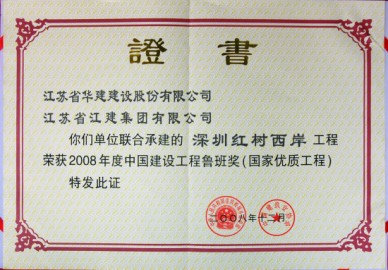 红树西岸工程位于深圳填海区,由3栋31层的折线形塔楼组成,建筑高度99.2米,建筑面积33.4万平方米,3幢高层住宅楼呈“风车”状组合在大面积水景花园之中,既富现代气息、又与自然环境和谐共生,是深圳湾畔极具标志性的高尚住宅建筑。工程2003年10月20日开工, 2006年3月28日竣工,获得2007年度深圳市优质工程、“金牛奖”;2007年度江苏省省外优质工程“扬子杯”;2007年度广东省优良样板工程、“金匠奖”;2005年度深圳市优质结构工程奖;2005年度深圳市新技术应用示范工程第一名;2005年度江苏省新技术应用示范工程;2006年11月通过建设部第五批全国建筑业新技术应用示范工程验收,“整体应用水平达到国内领先”;“控制隔音楼地面施工质量”QC成果于2006年4月在江苏省发布并荣获成果一等奖,该项QC成果于2006年7月参加中建协组织的全国工程建设优秀QC成果交流,小组荣获2006年全国工程建设优秀质量管理小组称号;2008年11月荣获鲁班奖。