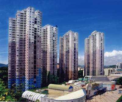 海景花园大厦B4楼座落在深圳湾畔。这是由深圳华侨城房地产公司投资兴建,中国华森建筑工程设计公司设计,江苏建安公司深圳一公司承建,第三工程处施工的一座超高层高品住宅楼。该工程建筑面积20145平方米,正负零以上高度104.4米,平面设计呈蝴蝶形状,共34层。工程1991年4月动工,1992年8月竣工,工期17个月。工程的结构形式为:桩基础上设基础承台及承台梁,上部为暗柱剪力墙结构承重体系。室内卫生间、厨房壁柜采用空心砖后塞墙,外墙装饰采用白、红、絳褐三种色彩的玻璃马赛克镶贴成剪影图案。内装修为:所有客房均采用席纹柚木地板楼面,变通白色乳胶漆天棚及墙面;电梯厅、卫生间、厨房墙面、地面均为彩色釉面砖镶贴;所有外门窗均为本色铝合金嵌白玻璃;屋面分部采用刚柔结合,表面铺设架空隔热板的构造做法。