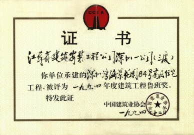 本工程在施工中能精心组织,通过QC小组活动,严格把关工程9个分部全部优良。在1993年的深圳市优质样板评选中名列第一,同时荣获1994年江苏省金牌奖和1994年建设部部优奖,1994年建筑工程鲁班奖。