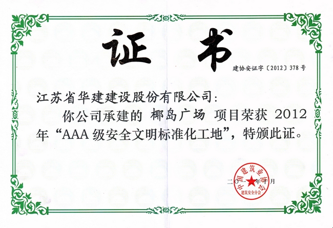 椰岛广场 时间:2013-01-17 11047 椰岛广场项目位于海口市龙华路,该工程总建筑面积115562平方米,其中地下室建筑面积20388平方米,1#-4#楼地上建筑面积58689平方米,建筑高度93.35米,5#-6#楼地上建筑面积36485平方米,建筑高度96.45米。工程于2011年4月30日开工,工期为480天。 2012年10月,该工程被中建协评为2012年“AAA级安全文明标准化工地”。