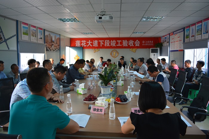 验收会由广安区委常委、官盛新区管委会副主任李荣盛主持。会议听取了施工、监理及设计单位工作总结报告,广安区住建局副局长周春兰代表验收小组发言。广安区副区长侯仁禄对莲花大道及官盛春天等安置房建设的质量、速度给予肯定,表示华建用一年时间完成了官盛新区从沟壑纵横到城市雏形的巨变值得祝贺。区委常委李荣盛宣读了验收小组验收结论,原则同意验收意见。他总结指出,莲花大道下段的竣工验收代表了官盛新区建设取得了可喜的阶段性成果,希望各参建单位继续发扬优良作风再创佳绩。区质监站等主管单位赞扬华建在质量、安全和效益上下了真功夫,现场管理尤其是施工理念在广安树立了标杆和模范。