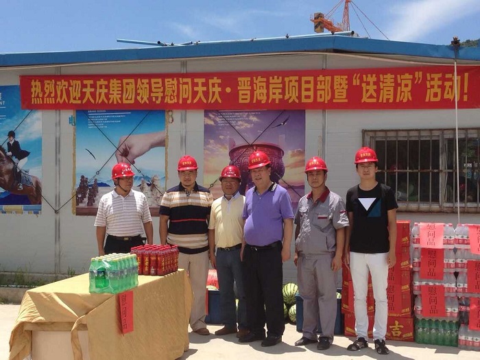 千里送清凉——天庆集团董事长韩庆慰问我司一线职工 时间:2015-08-05 3875 8月4日中午,烈日当空,骄阳似火。甘肃天庆房地产集团有限公司董事长韩庆一行不远千里来到广东珠海,顶着烈日,冒着酷暑,在项目负责人陈建的陪同下,慰问我司承建的“天庆·晋海岸”项目一线施工人员,给工人们送来了西瓜、矿泉水、王老吉等饮品和深情问候,让广大一线职工在炎炎烈日下感受到阵阵清凉。