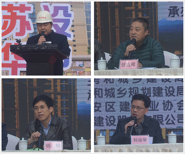 官盛春天项目经理曹亚明代表公司介绍了官盛春天项目建筑安全文明施工标准化工作开展情况和主体结构施工质量控制情况;广安区委常委、政法委书记万良政通报了今年以来广安区质量安全工作开展情况;广安市住建局党组成员、总工程师刘运举号召各参会单位以我司官盛春天项目为榜样,比学赶超、奋勇拼搏,努力实现质量安全新突破和新发展,为不断推动全市建筑质量安全水平做出贡献;四川省质安监督总站副站长任兆祥结合全省实际从狠抓安全生产工作、工程质量治理长效监管机制建立及质量安全责任落实三方面进行强调,并提出了下步工作开展计划和要求。
