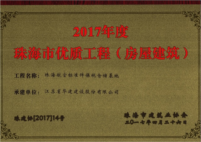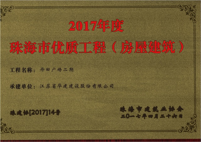 公司2项目获评珠海市房屋建筑优质工程 时间:2017-05-16 3510 近日,珠海市建筑业协会发文公布2017年度珠海市优质工程名单,我司承建的珠海航空标准件保税仓储基地和丹田广场二期的2个项目榜上有名。