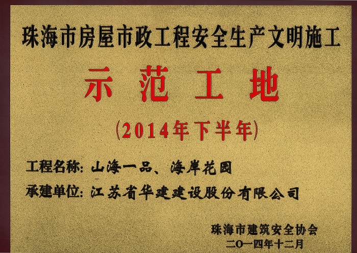山海一品海岸花园荣获2014年下半年珠海市房屋市政工程安全生产文明施工示范工地